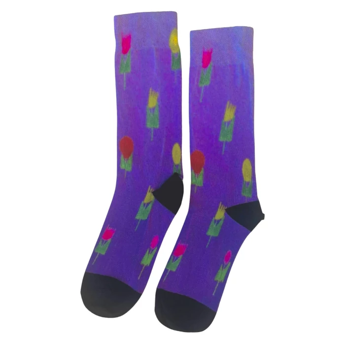 A színátmenetes zoknit Kiss Péter autista fiatal grafikája díszíti.